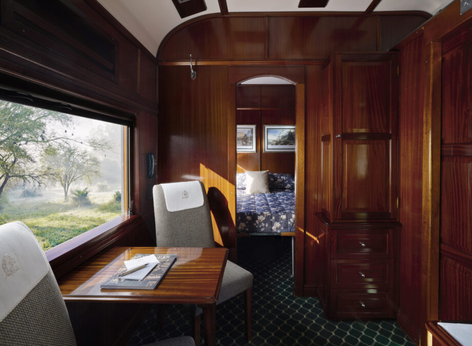 For years, these were Rovos Rail’s “standard” cabins, but they are huge and beautifully appointed, in comparison with other luxury trains. There are three to each train carriage. Deluxe Suites have either side-by-side twin beds or large double-size bed and en-suite toilet, sink and shower. These Suites also have a small lounge area with writing desk and two chairs. They measure about 108 square feet.